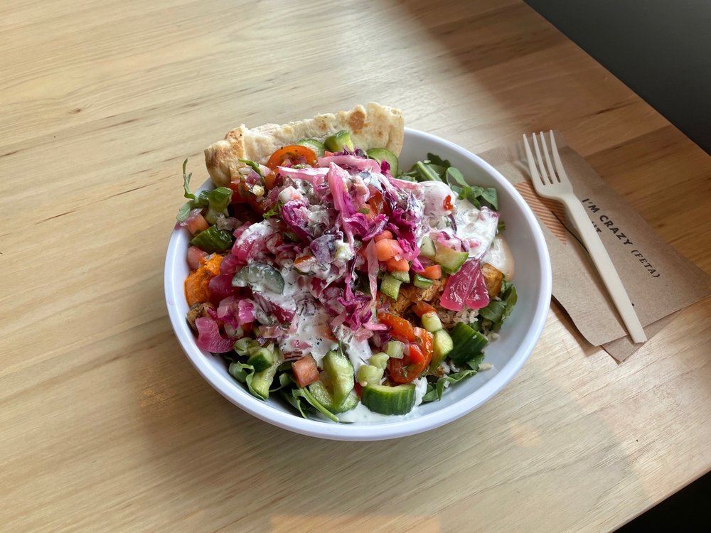 Falafel, roasted veggies, hummus, Crazy Feta®, pickled onions, pita crisps, lentils, rice, greens, skhug, more